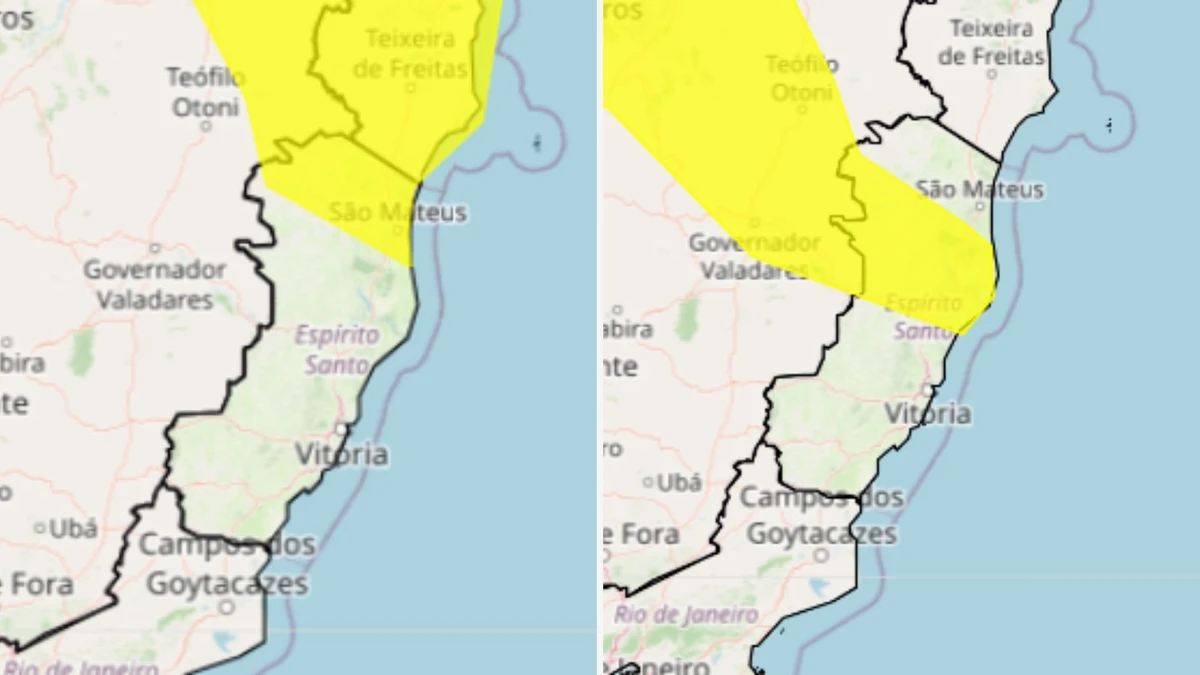 O Espírito Santo recebeu dois alertas amarelos de chuvas intensas, com diferença no tempo: um é válido até o final desta quarta-feira (19), e outro até a manhã de quinta-feira (20). Os avisos, emitidos pelo Instituto Nacional de Meteorologia (Inmet), indicam até 50 mm de chuva por dia, com ventos entre 40 e 60 km/h. Confira quais cidades receberam cada um deles:>