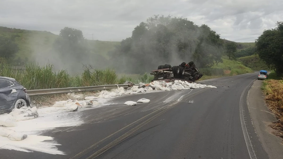 Carreta com 18 toneladas de farinha atinge carro e deixa 4 feridos em João Neiva