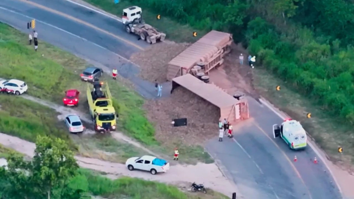 A carga ficou espalhada pela via. O tráfego precisou ser desviado por uma estrada de terra ao lado da rodovia. Equipes da Ecovias Capixaba atuam no local com sinalização e orientação aos motoristas para a liberação do trecho. Não há registro de feridos até o momento.>