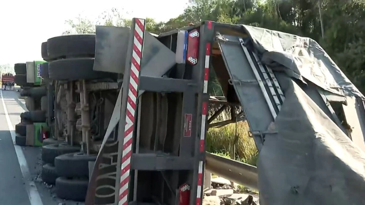 O motorista estava sozinho no momento do acidente. Ele precisou de atendimento médico e foi levado para a Unidade de Pronto Atendimento (UPA) de Guarapari, mas recebeu alta logo em seguida. A Ecovias Capixaba, que administra a rodovia, disse que o condutor contou que se distraiu ao tentar pegar um objeto no painel e perdeu o controle da direção. A carga de granito caiu fora da pista.>