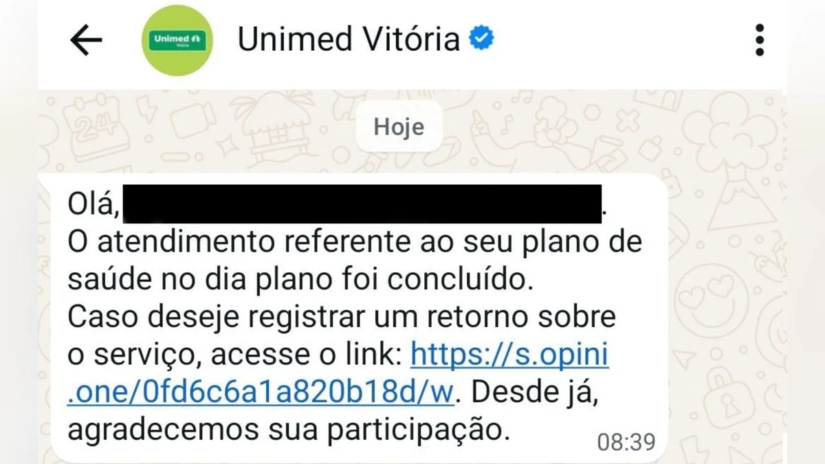 Uma mensagem enviada pela Unimed Vitória nesta sexta-feira (23) chamou a atenção de usuários que afirmaram não ter realizado nenhum procedimento recente e passaram a desconfiar de um possível golpe. O aviso foi encaminhado por WhatsApp e informava que um atendimento havia sido concluído, com um link para avaliação do serviço. >