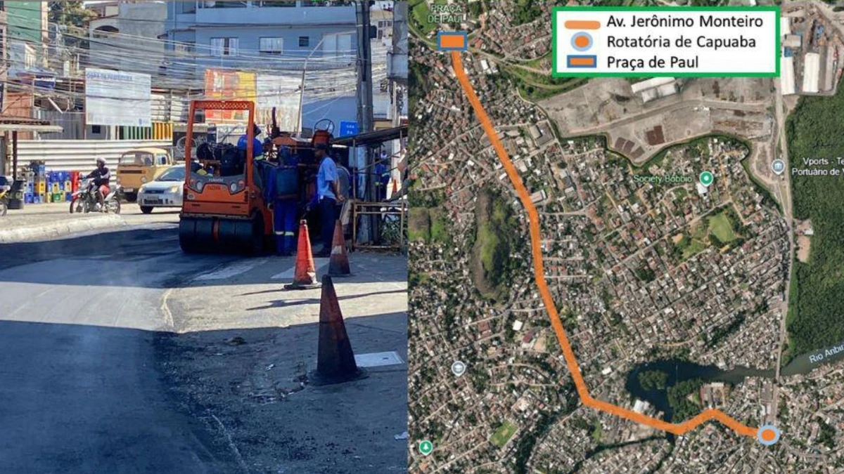 A Avenida Jerônimo Monteiro, em Vila Velha, está funcionando no sistema "pare e siga" desde a quinta-feira (21), para a realização de obras de recapeamento no local, no trecho que começa no Trevo de Capuaba e vai até ao Viaduto de Paul, totalizando dois quilômetros. Os condutores devem buscar outras rotas para evitar congestionamentos na região. As obras devem ser concluídas em um prazo de 15 dias, mas dependendo das condições climáticas. Para que as máquinas transitem, será necessária a retirada de veículos estacionados ao longo da via.>