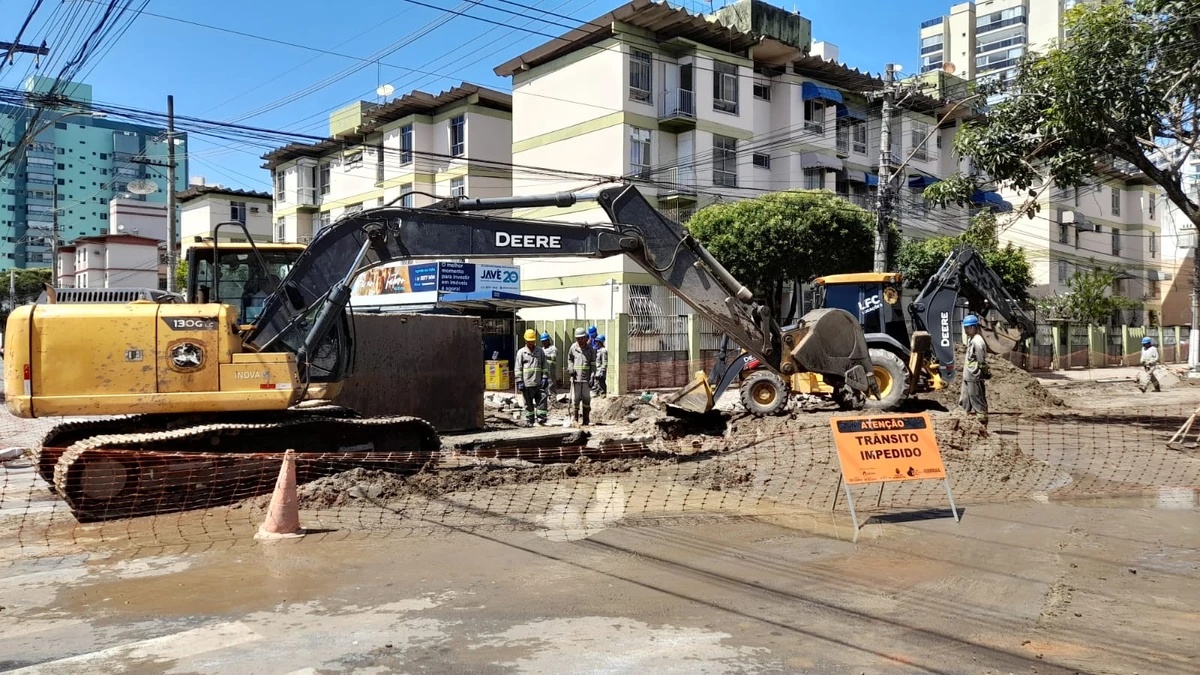 A reportagem de A Gazeta esteve no local e apurou que o rompimento da tubulação aconteceu de madrugada e já foi resolvido. Mas a obra no local permacece. >