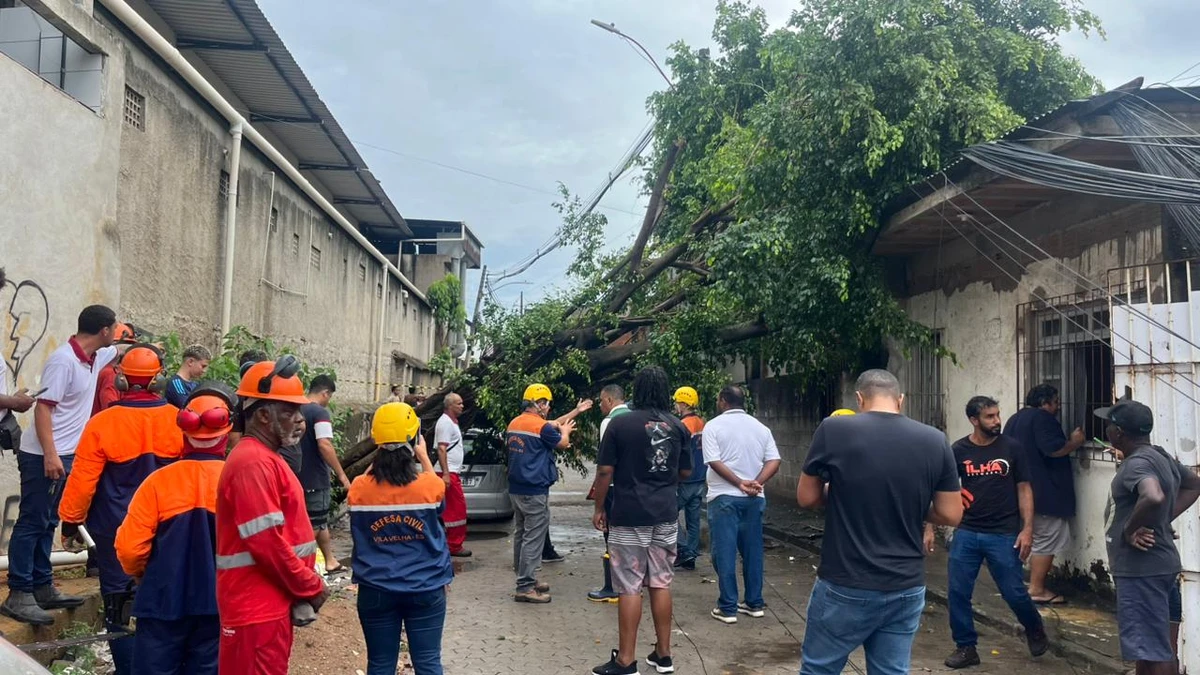 O temporal que atingiu Vila Velha nesta terça-feira (20) causou problemas em diversas partes do município. Na Rua Marinheiro Popeye, no bairro Ilha da Conceição, por exemplo, a queda de uma árvore de grande porte sobre a rede elétrica danificou quatro postes, deixando 66 clientes do entorno sem energia.>
