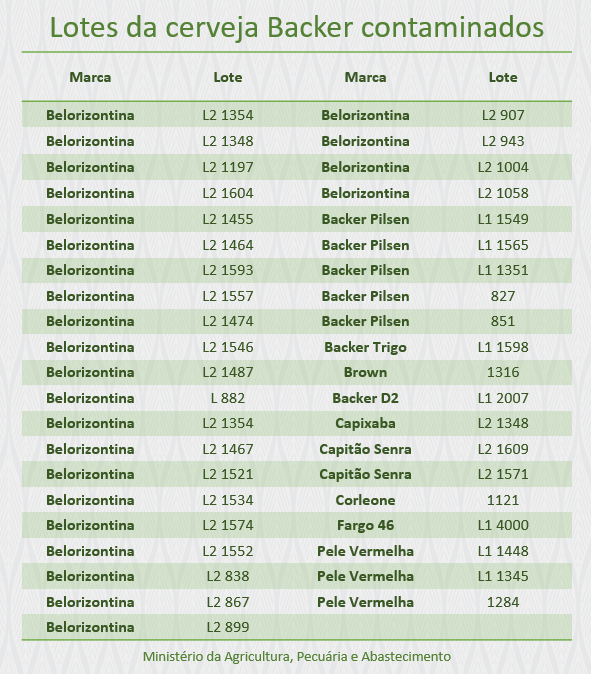 Segundo informações divulgadas pelo ministério nesta terça-feira (28), até o momento, as análises constataram 41 lotes contaminados de 10 rótulos da cervejaria: Belorizontina, Backer Pilsen, Backer Trigo, Brown, Backer D2, Capixaba, Capitão Senra, Corleone, Fargo 46 e Pele Vermelha.>