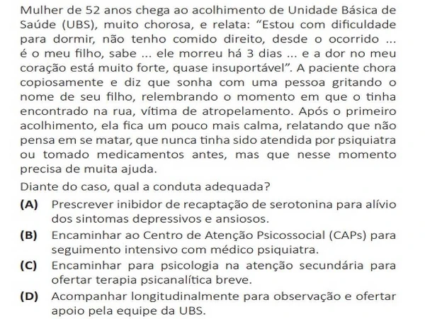 Outra questão com grande diferença abordou o luto e a conduta médica na atenção básica de saúde. A resposta correta ("acompanhar longitudinalmente para observação e ofertar apoio pela equipe da UBS") foi marcada por 72,6% dos participantes de instituições públicas, enquanto a taxa nas faculdades privadas foi de 55,1%.>