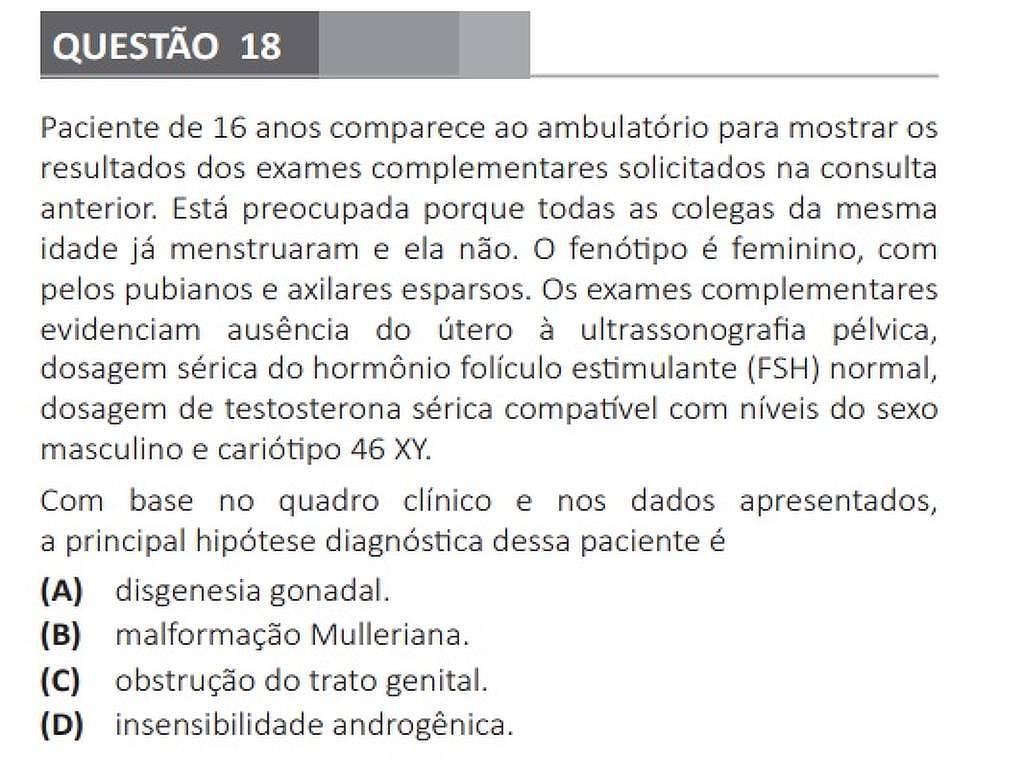 O maior abismo entre alunos de cursos privados e públicos foi visto em uma questão sobre insensibilidade androgênica, termo médico sobre condição genética em que a pessoa tem genes e hormônios masculinos, mas o corpo não reage a esses hormônios.>