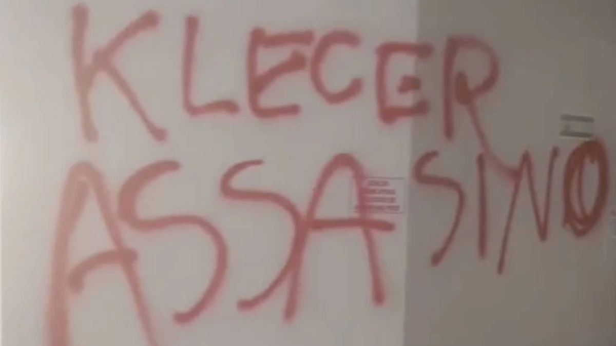 As paredes do apartamento foram pichadas com tinta vermelha. Em uma delas, a palavra "assassino" foi escrita. As imagens também mostram marcas de vandalismo em diferentes cômodos do imóvel. A depredação se estendeu às áreas comuns do prédio. Na recepção do condomínio, sofás, janelas e paredes foram pichados com frases direcionadas contra o síndico, inclusive com o nome dele, chamando-o de "safado" e "assassino".>