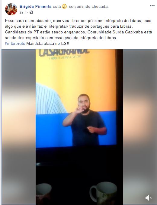 A Associação de Surdos de Vitória vai apresentar uma queixa-crime contra Cássio de Oliveira Veiga, que atuou, nas propagandas eleitorais de políticos do Espírito Santo, como intérprete de Libras sem ter o curso de tradutor.>