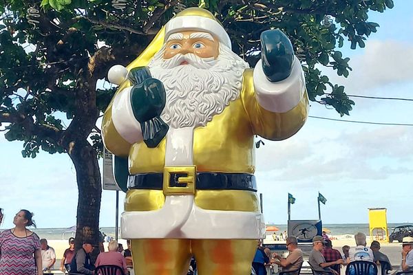 A figura aparece em vídeos divulgados no perfil oficial da prefeitura, que também mostram outras representações do Papai Noel nas cores tradicionais no local. Segundo o município, as cores foram escolhidas para transmitir valores associados ao potencial turístico da cidade e ao resgate de memórias infantis.>