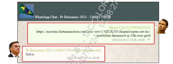 Em 8 de fevereiro, dia do leilão, Cid avisa a Bolsonaro que "daqui a pouco é o kit". E envia um link no Facebook, provavelmente com a transmissão ao vivo do evento. A joia, contudo, não foi arrematada. O tenente-coronel decide, no dia 13 de fevereiro, realizar mais uma tentativa de leilão. Em março, contudo, Cid diz à Fortuna Auction que não tem mais interesse.>