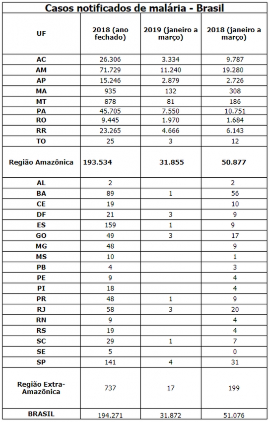 Entre janeiro e março deste ano, o Brasil notificou 31.872 novos casos de malária. No mesmo período do ano passado, foram registrados 51.076 casos uma redução de 38%. Em todo o ano de 2018, o país contabilizou 194.271 casos da doença. No Dia Mundial da Malária, lembrado nesta quinta-feira (25), o Ministério da Saúde lançou a campanha Brasil Sem Malária, com foco na região amazônica, que concentra mais de 99% dos casos.>