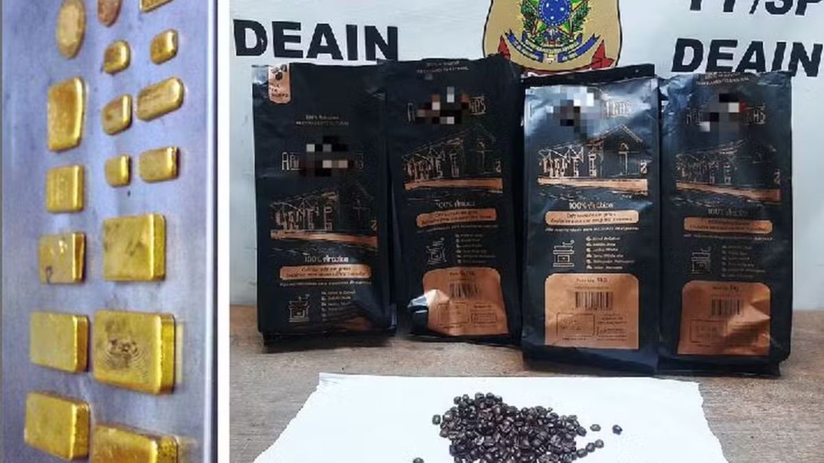Foram escondidas 17 barras de ouro em pacotes de café. O material estava envolto em fita isolante e pesava 6 kg. O passageiro não apresentou documentação legal para o transporte do material. Por isso, o estrangeiro foi preso pela prática de crime contra a ordem econômica - usurpação de bens pertencentes à União.>
