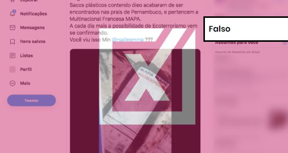 O texto verificado pelo Comprova inicia com a pergunta E agora Lacron ????, em uma referência ao presidente da França, Emmanuel Macron, crítico ao presidente Jair Bolsonaro (PSL). Na sequência, o boato afirma que a possibilidade de ecoterrorismo vem se confirmando no Nordeste brasileiro. As imagens mostram duas embalagens plásticas que continham óleo, encontradas nas areias do Cabo de Santo Agostinho, cidade do Grande Recife, em Pernambuco.>