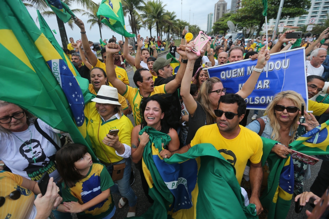 O clima é de festa na Avenida Lucio Costa, na Barra da Tijuca, no Rio de Janeiro, em frente ao condomínio onde mora o candidato à Presidência pelo PSL, Jair Bolsonaro. Pessoas chegam a todo momento vestidas com a camisa do Brasil. Também há uma queima de fogos. Motoristas param para acionar a buzina e provocam trânsito na região.>