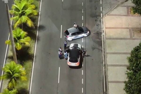 O drone operado por agentes da Lei Seca fez o flagrante na Barra da Tijuca, zona oeste, no dia 14 de abril; as imagens foram divulgadas na sexta (19). O motorista de camisa azul-claro é multado por não ter carteira de habilitação.>