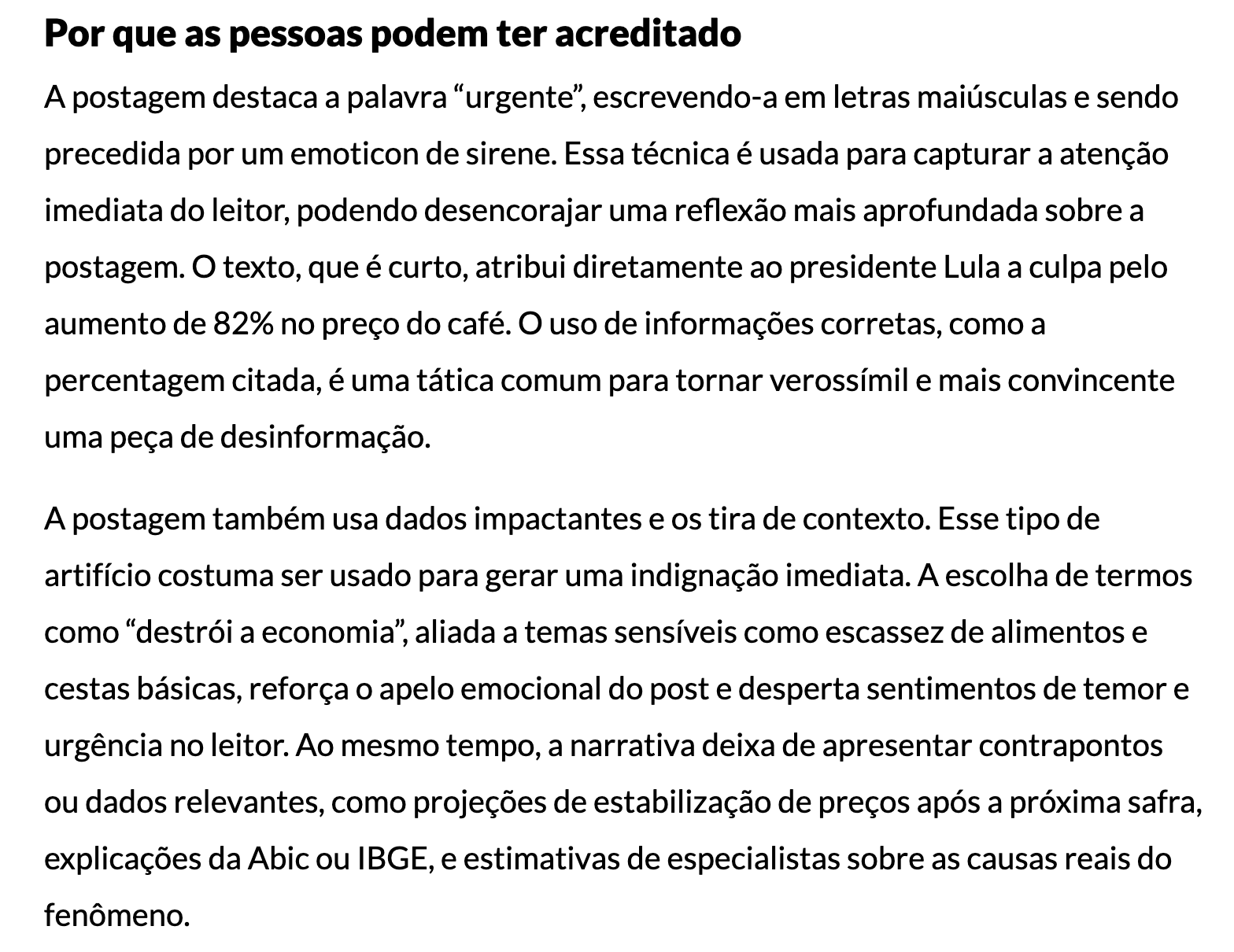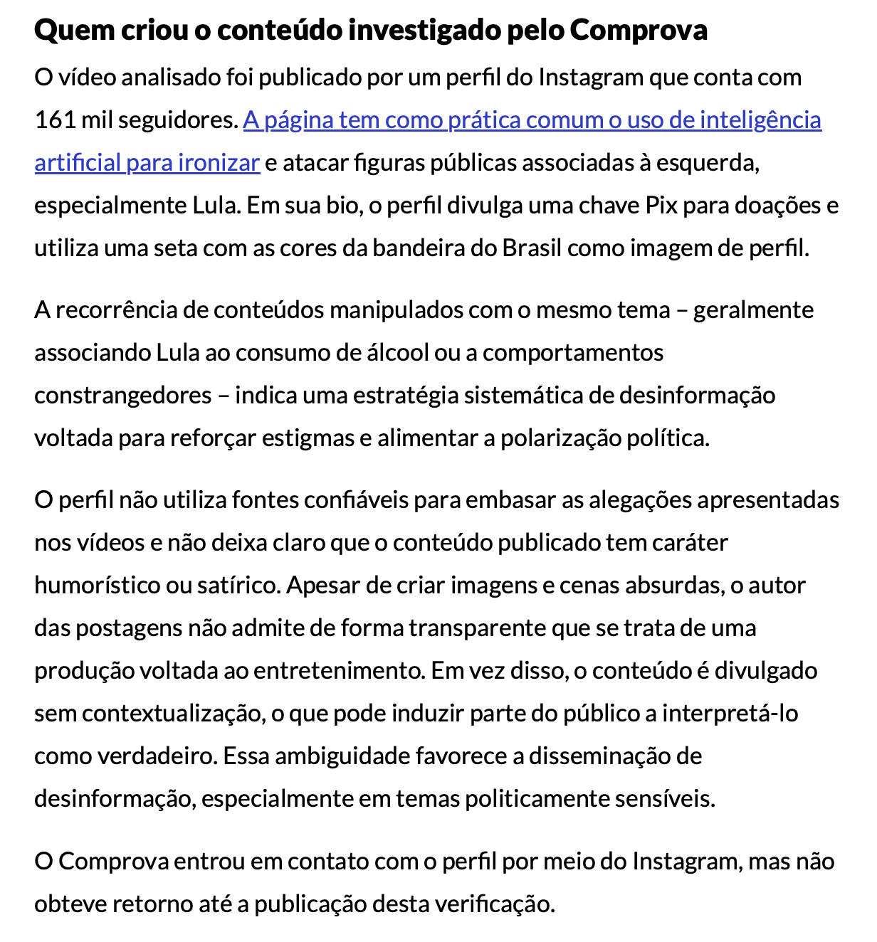 Assim, desde o início de junho, verificações publicadas pelo Comprova investigam as evidências e alegações dos conteúdos virais, mas também quem são os criadores desses conteúdos e seus interesses, e quais as táticas utilizadas para persuadir as pessoas e levá-las a acreditar no que foi publicado. E aqui tentamos mostrar por que o conteúdo é convincente, por que podemos ter confiado em quem o publicou.>