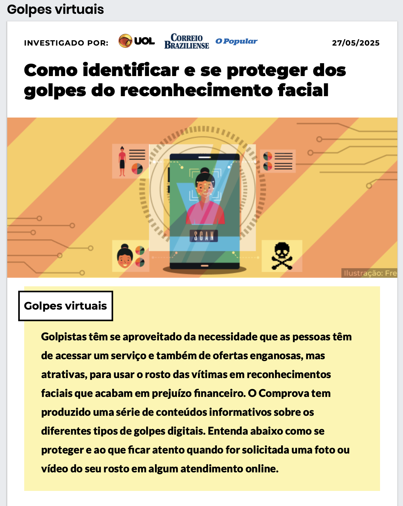 Como parte das mudanças no Comprova, em 1º de abril começamos a publicação de verificações sobre golpes virtuais. Além de atender a uma demanda crescente por verificação, entendemos que abordar esse tipo de conteúdo, que afeta diretamente as pessoas, causando danos e prejuízos, é uma forma de difundir a cultura da verificação de fatos, dar transparência ao processo investigativo e gerar confiança na aplicação dos padrões de checagem.>