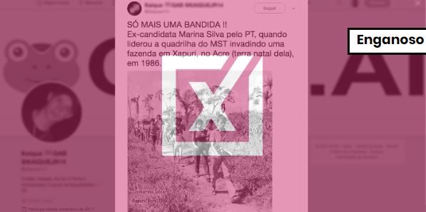 É enganoso um texto que, associado a uma foto, afirma que a candidata à Presidência da República pela Rede, Marina Silva, teria invadido uma fazenda no Acre em 1986 de maneira semelhante ao Movimento dos Trabalhadores Rurais Sem Terra (MST). Na verdade, a foto que circula no WhatsApp mostra um "empate", manifestação feita por seringueiros para impedir o desmatamento na Fazenda Bordon, em Xapuri.>