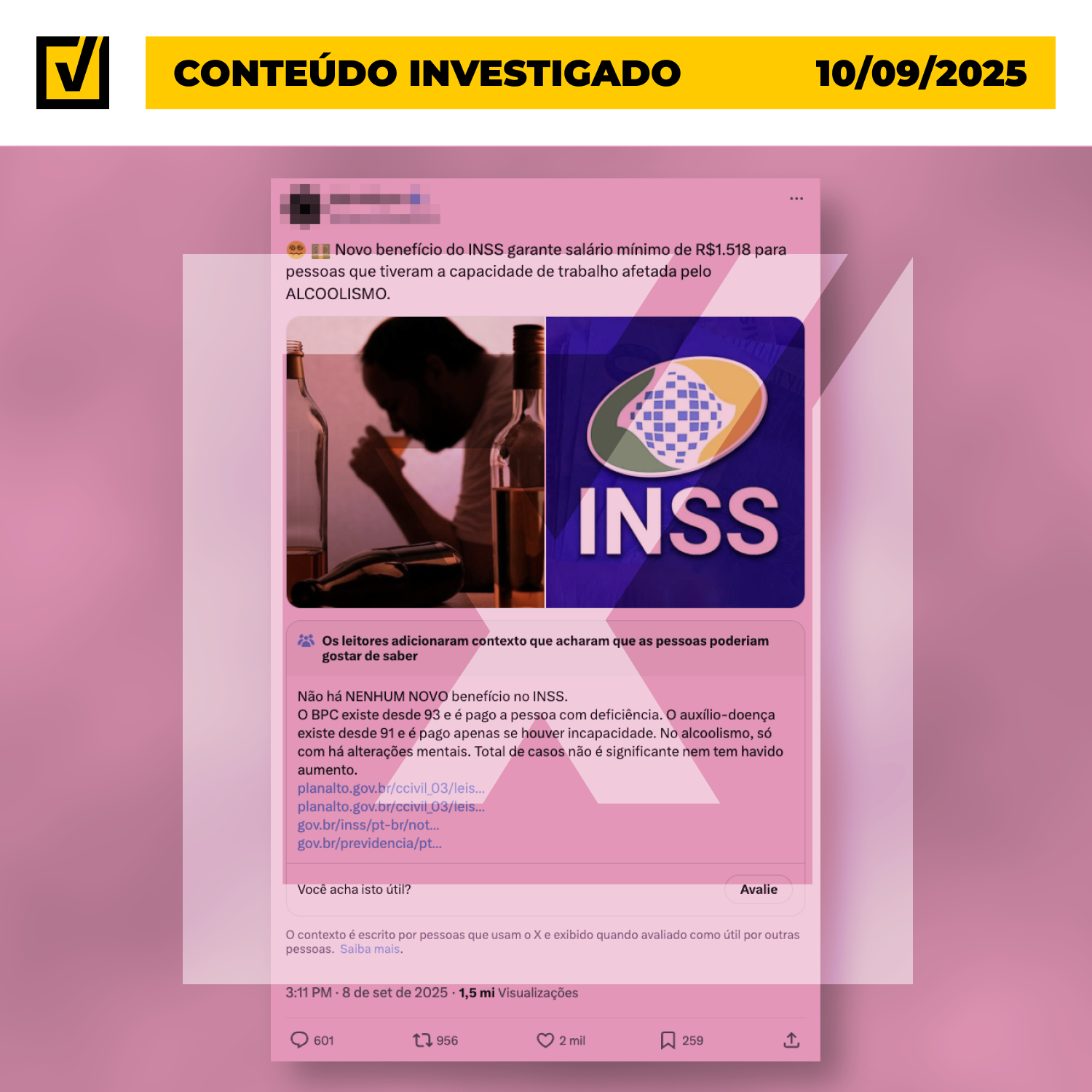 Ao contrário do que afirma uma postagem nas redes sociais, o governo federal não criou um benefício chamado “Bolsa alcoólatra”. Não existe no Instituto Nacional do Seguro Social (INSS) ou em qualquer política pública vigente um programa que pague, automática ou especificamente, um salário mínimo a pessoas com dependência de álcool. A publicação investigada foi feita em 8 de setembro no X. O post usa emojis e uma montagem com a logomarca do INSS e a foto de um homem bebendo para afirmar que o governo de Luiz Inácio Lula da Silva (PT) teria lançado o benefício. >