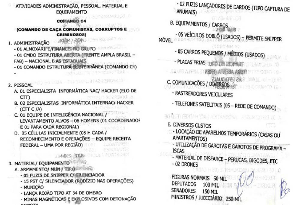 BRASÍLIA - Documento apreendido pela Polícia Federal que fundamentou as prisões preventivas na sétima fase da Operação Sisamnes, desta quarta-feira (28), lista os serviços oferecidos pelo grupo denominado C4, que significa "Comando de Caça Comunistas, Corruptos e Criminosos".>