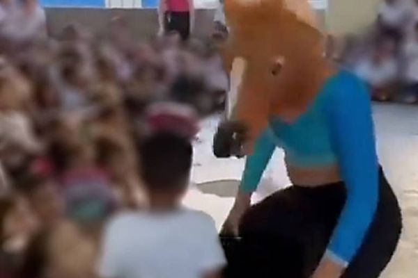 O vídeo gravado na escola mostra centenas de crianças no pátio assistindo à apresentação. De acordo com a Secretaria Municipal de Cultura, o grupo havia indicado que o espetáculo tinha classificação livre.>