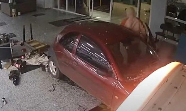 Por fim, ele arrancou com o KA, deu a volta no estabelecimento e acelerou para dentro do supermercado. Os vidros foram arrebentados, o veículo derrubou uma mesa e um banco no hall e só parou ao bater em um caixa eletrônico. Tudo foi gravado pelo circuito interno de segurança.>