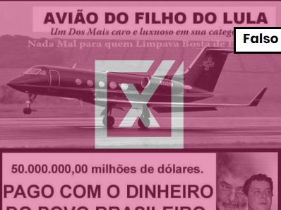 É falsa a informação, presente em montagem que circula no WhatsApp e no Facebook, de que um dos filhos do ex-presidente Lula (PT), Fábio Luis Lula da Silva, o Lulinha, é dono de um avião avaliado em US$ 50 milhões.>