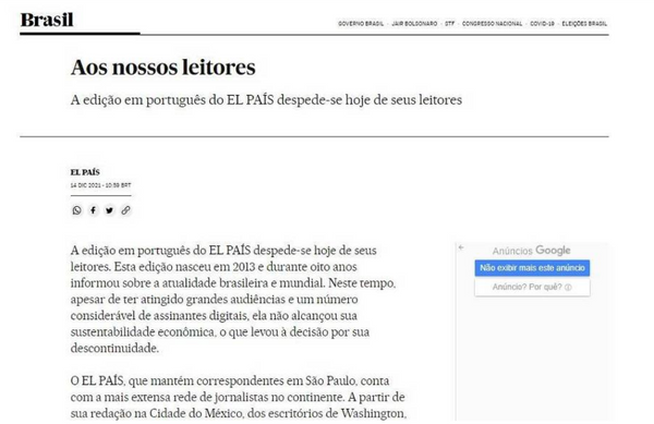 O jornal espanhol El País anunciou nesta terça-feira (14) o encerramento de suas operações no Brasil. Lançada em 2013, a versão brasileira do veículo não conseguiu alcançar a sustentabilidade econômica nestes oito anos de operação, "apesar de ter atingido grandes audiências e um número considerável de assinantes digitais", informou em comunicado no seu site. A equipe local, de 17 jornalistas, foi pega de surpresa pelo anúncio. >