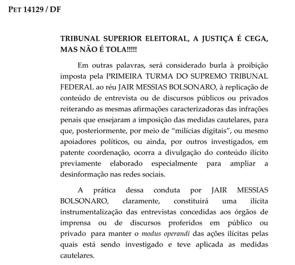 No último domingo, 3, durante a manifestação realizada na Avenida Paulista, o ex-presidente discursou por meio de um contato pelo telefone com o filho Flávio Bolsonaro, que publicou o discurso nas redes. Moraes havia determinado que Bolsonaro não poderia usar as redes, mesmo por meio de terceiros.>