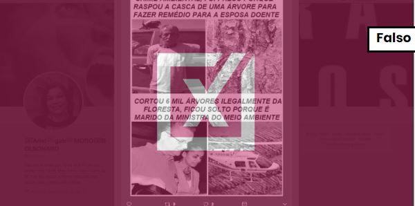 A montagem compartilhada destaca a imagem de um homem idoso e de uma árvore raspada com a frase: "Crime ambiental, foi preso porque raspou a casca de uma árvore para fazer remédio para a esposa doente". Logo abaixo, está destacada a imagem de Marina e de seu marido Fábio Vaz de Lima e, ao lado deles, uma imagem aérea de uma madeireira. Acima das fotos, a frase: "Cortou 6 mil árvores ilegalmente da floresta, ficou solto porque é marido da ministra do Meio Ambiente" (sic). A prisão de um homem por raspar árvore realmente ocorreu (leia mais abaixo), mas as informações sobre o marido de Marina Silva são falsas.>