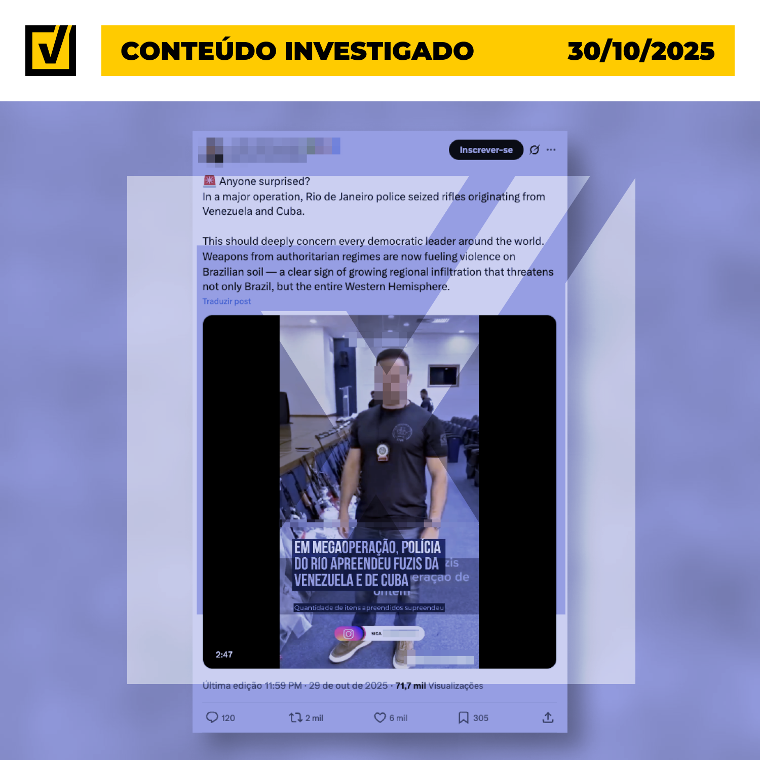 Conteúdo analisado: Posts nas redes sociais usam o vídeo de um delegado da Polícia Civil do Rio, no qual ele detalha os armamentos apreendidos na operação realizada em 28 de outubro nos complexos da Penha e do Alemão. Sobre o vídeo, há um texto segundo o qual fuzis de Cuba e da Venezuela teriam sido encontrados entre as apreensões. >