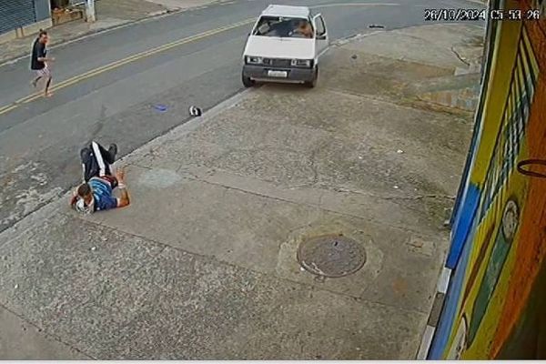 Na sequência, este homem também é atingido de frente pelo carro, que o joga a alguns metros, mas ele se levanta rapidamente. A primeira vítima senta-se na sarjeta da calçada, visivelmente machucada, quando volta a ser atingida pelo Uno branco em alta velocidade, segundos depois.>