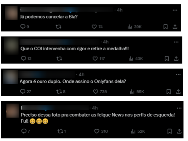 O post enganoso foi publicado em uma conta no X que se define como humorística e uma parte dos leitores acreditou no que escreveu o autor do post. Uma mulher comentou “Preciso dessa foto pra combater as feique (sic) News nos perfis de esquerda!” e outra disse “Já podemos cancelar a Bia?”.>