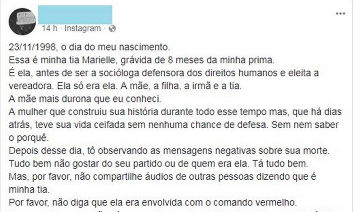"23/11/1998, o dia do meu nascimento. Essa é minha tia Marielle, grávida de 8 meses da minha prima. É ela, antes de ser a socióloga defensora dos direitos humanos e eleita a vereadora. Ela só era ela. A mãe, a filha, a irmã e a tia. A mãe mais durona que eu conheci. A mulher que construiu sua história durante todo esse tempo mas, que há dias atrás, teve sua vida ceifada sem nenhuma chance de defesa. Sem nem saber o porquê. Depois desse dia, tô observando as mensagens negativas sobre sua morte. Tudo bem não gostar do seu partido ou de quem era ela. Tá tudo bem. Mas, por favor, não compartilhe áudios de outras pessoas dizendo que é minha tia. Por favor, não diga que ela era envolvida com o comando vermelho. E, essencialmente, não vá nas postagens da minha prima dizer que ela é filha do Marcinho VP e que minha tia engravidou aos 16. Isso foi o cúmulo pra perceber o quanto as pessoas são insensíveis com a dor de uma filha. Por favor, respeitem a dor de todos, seja de quem for, apenas respeitem. E principalmente, não inventem mentiras sobre ela ou alguém da família achando que vai estar passando batido, porque não vai. Por fim, essa era Marielle. A que morreu por conta de seus ideais, e lutando por eles.">