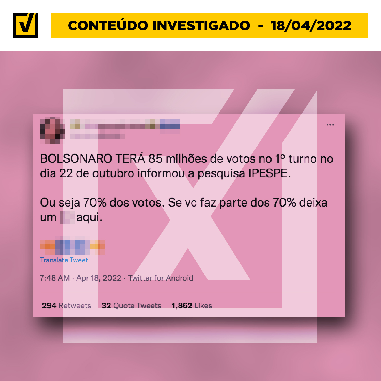 Conteúdo investigado: Um tuíte diz que o instituto Ipespe informou que Jair Bolsonaro (PL) terá 85 milhões de votos no 1º turno e que isso equivaleria a 70% dos votos. A postagem termina com um pedido para que apoiadores do presidente interajam comentando. >