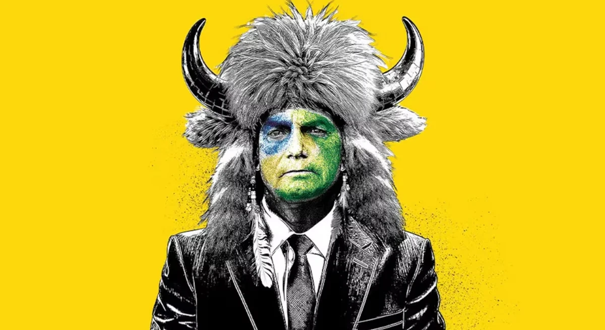 Bolsonaro ilustra a capa com o rosto pintado de verde e amarelo e um chapéu viking de pele de animal, em uma referência a um dos invasores do Capitólio nos Estados Unidos. No episódio, em janeiro de 2021, apoiadores de Donald Trump tentaram impedir uma sessão do Congresso para validar a eleição de Joe Biden. Um dos homens usava chapéu semelhante, com o rosto pintado com as cores da bandeira norte-americana, e se tornou um símbolo do movimento. >