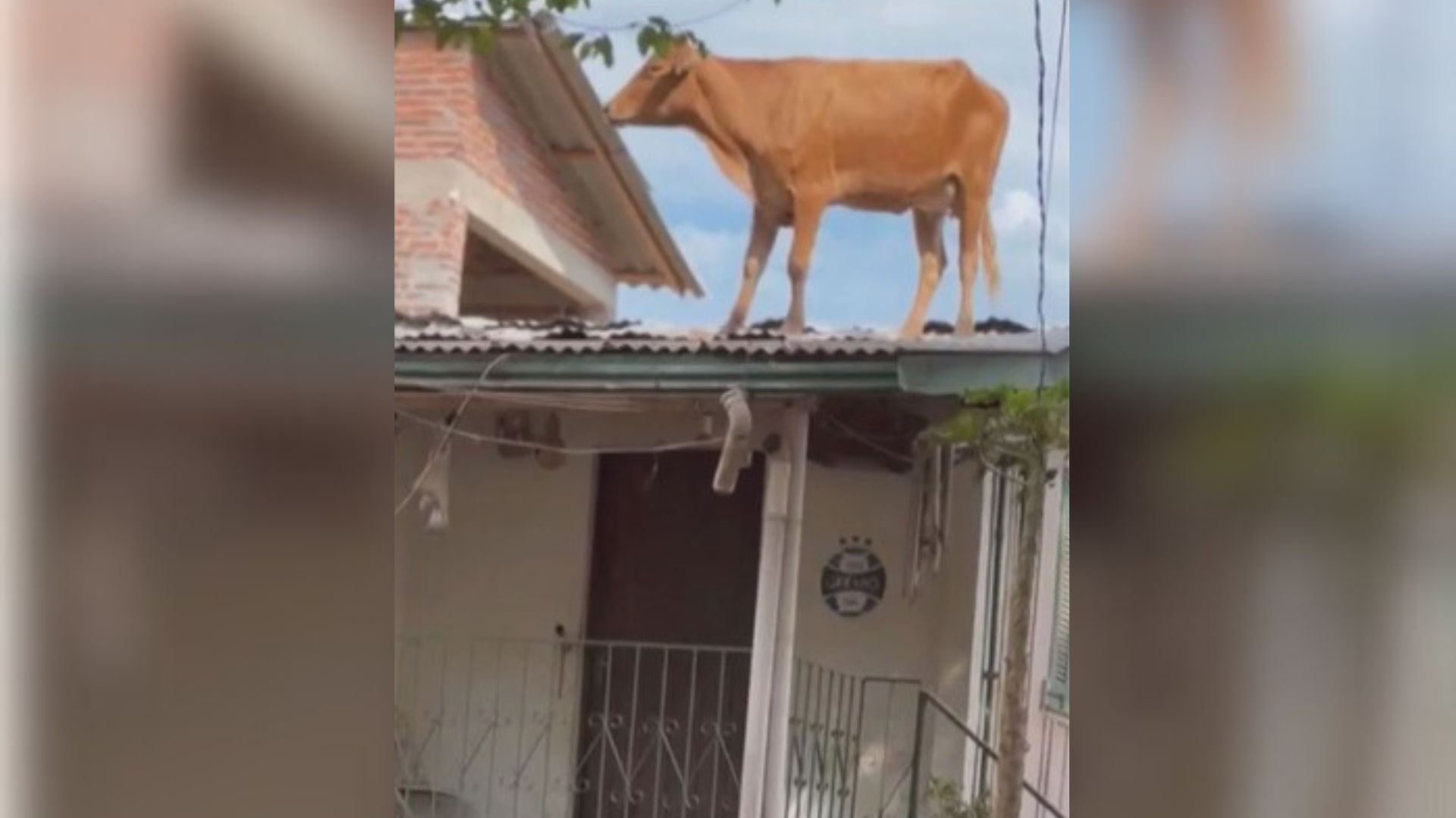 Na tarde desta quinta-feira (7), uma vaca foi resgatada do telhado de uma casa em Estrela, depois de ficar horas ali. Ela foi levada pela força da água na noite anterior. Um vídeo mostra o animal andando em cima do telhado, logo após o dono chamar por Mimosa.>