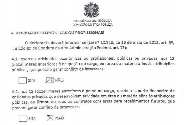 Documento traz assinalados a opção "não" para as seguintes perguntas: "exerceu atividade econômicas ou profissionais, públicas ou privadas, nos 12 meses anteriores à ocupação do cargo, em área ou matéria afins às atribuições públicas, que possam gerar conflito de interesses" e "nos 12 meses anteriores à posse no cargo, recebeu suporte financeiro de entidades privadas que desenvolvem atividade em área ou matéria afins às atribuições públicas, ou firmou acordos ou contratos com estas para recebimentos futuros, que possam gerar conflito de interesses" >