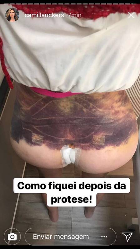 A youtuber cearense Camilla Uckers, de 25 anos, chocou os internautas ao desabafar no Instagram que sofreu sérias complicações com as próteses de silicone que colocou nos glúteos. Após realizar duas cirurgias plásticas no final do ano passado, sendo uma no nariz, ela afirma que os implantes que colocou no bumbum afetaram o seu nervo ciático e causaram uma infecção generalizada, deixando a impossibilitada de andar.>