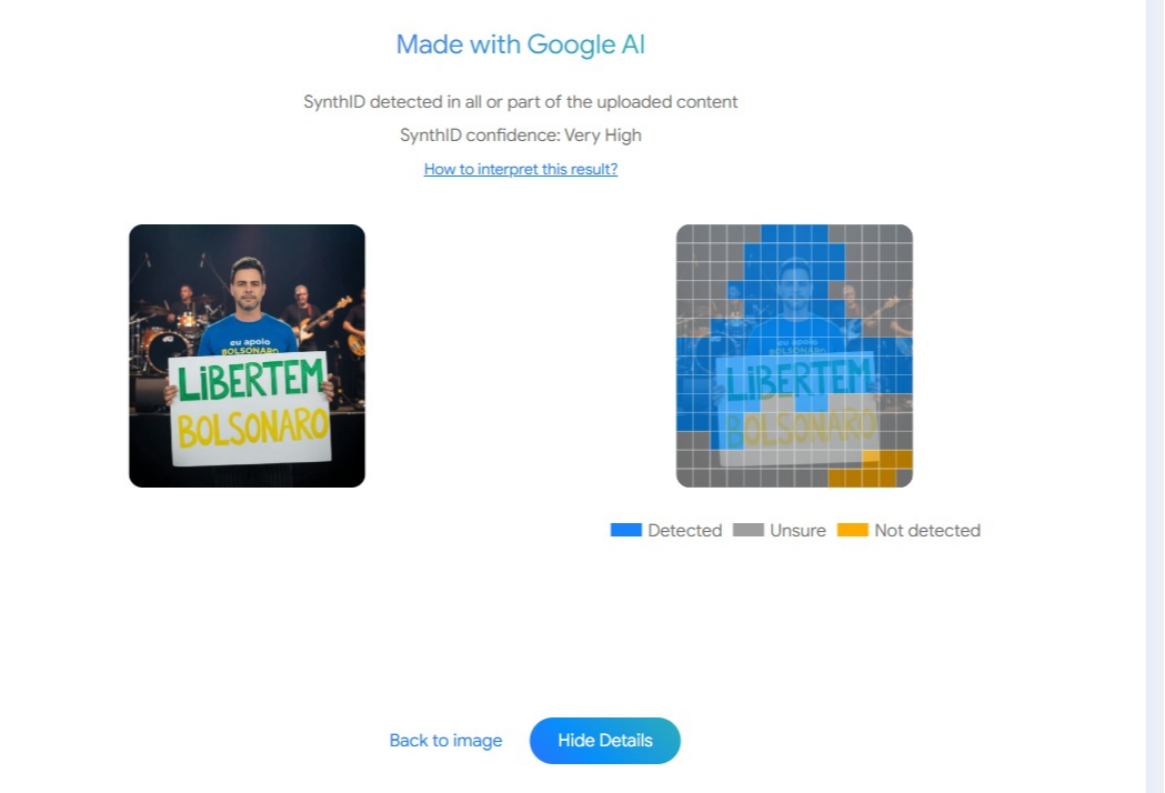 Como o Comprova explicou em junho, ferramentas de detecção de inteligência artificial podem falhar em buscas e checagens, mas, neste caso, a plataforma utilizada é do Google e mostrou que a imagem foi feita com outras ferramentas do próprio Google.>