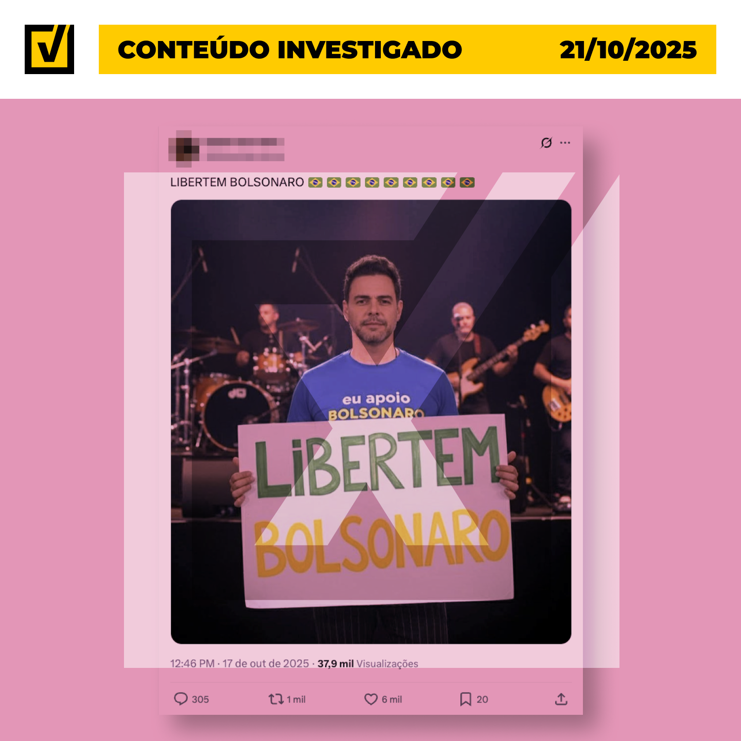 Está circulando no X uma imagem na qual o cantor Zezé Di Camargo aparece supostamente segurando um cartaz pedindo liberdade para o ex-presidente Jair Bolsonaro (PL), condenado à prisão por atentar contra a democracia, e vestindo uma camisa escrita “Eu apoio Bolsonaro”. A imagem não é verdadeira e foi gerada por inteligência artificial. >