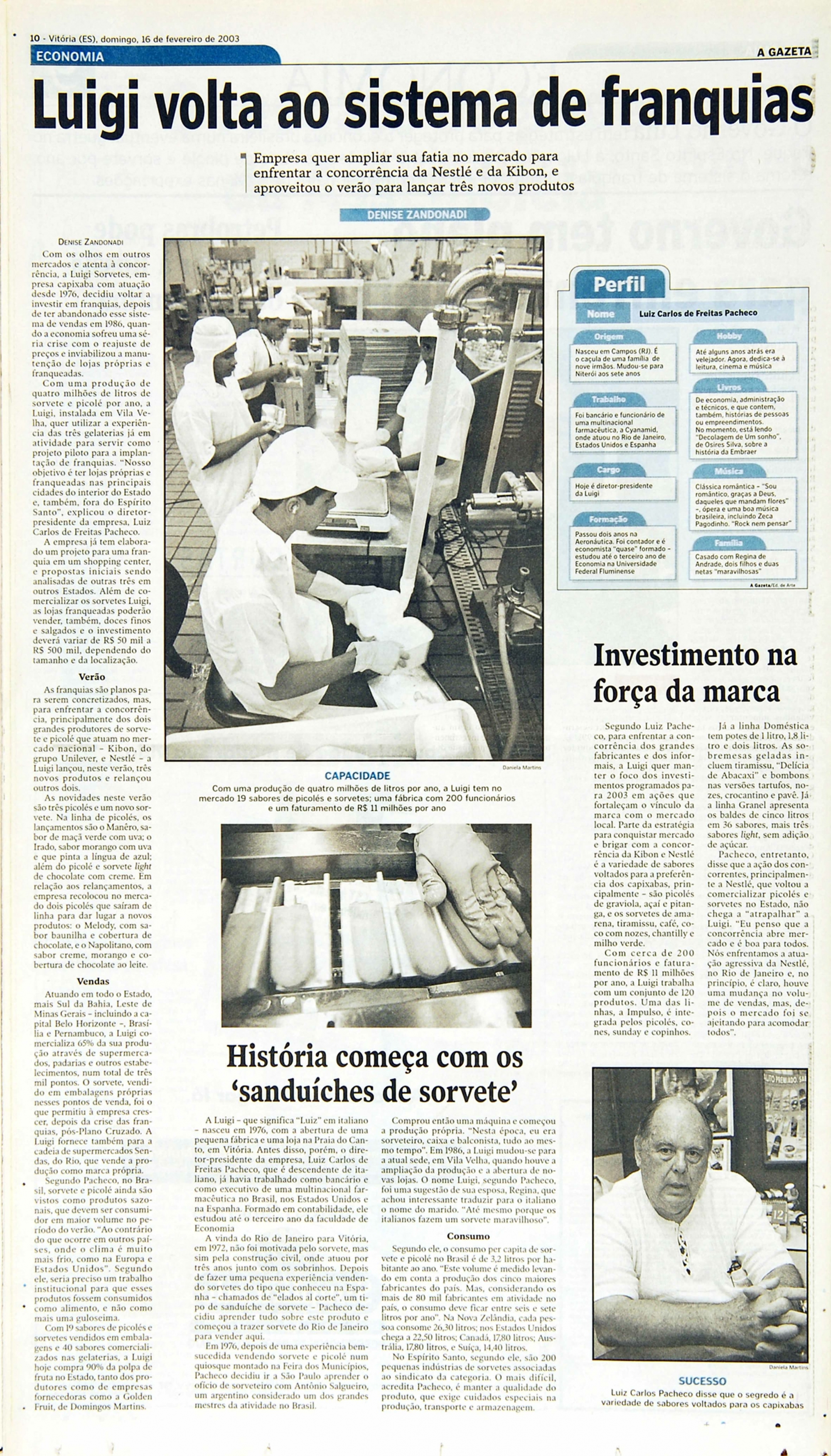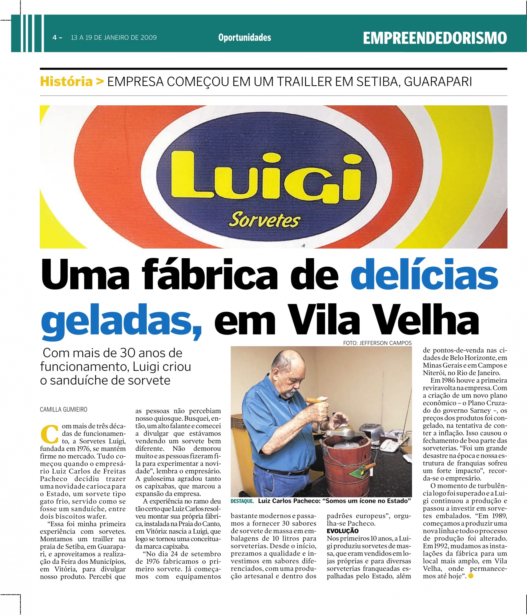 Com mais de três décadas de funcionamento, a empresa capixaba Luigi conquistou milhares de fãs com suas delícias refrescantes. O gato frio um tablete de sorvete entre dois biscoitos wafers foi a grande sensação que impulsionou o sucesso da empresa no Espírito Santo. As sobremesas, que eram produzidas aqui no Estado, enfrentavam as grandes concorrentes de nível nacional como Kibon, do grupo Unilever, e Nestlé.>