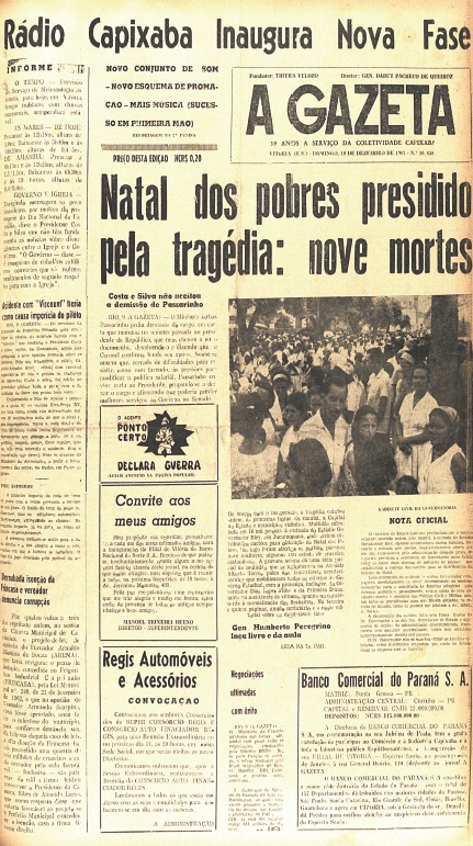 "Nove pessoas morreram e outras quatorze foram socorridas no Pronto Socorro de Vitória, vítimas da tragédia ocorrida ontem (sábado, 10 de dezembro de 1967) pela manhã no Estádio Governador Bley, na Avenida Alberto Torres, em Jucutuquara, nesta Capital, quando ao se abrirem os portões para a distribuição de cartão de Natal, uma multidão invadiu as dependências do estádio provocando a queda e pisoteamento das vítimas. >