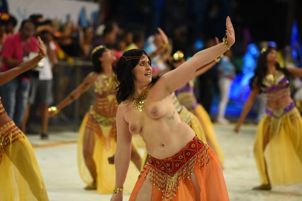 O desfile foi composto por 1,2 mil integrantes distribuídos em 17 alas. Em um de seus carros alegóricos, naturistas de diversas cidades do país representaram a atividade que a dançarina ajudou a difundir no Brasil. >