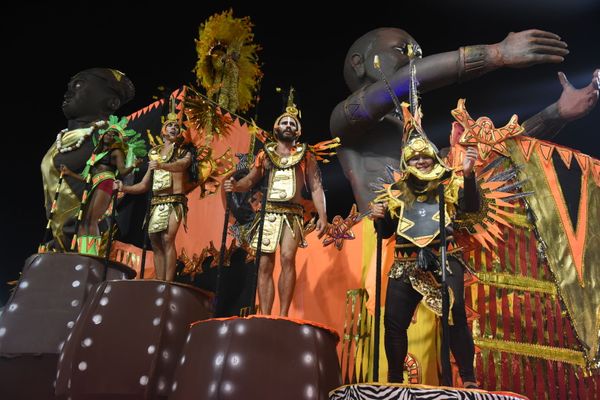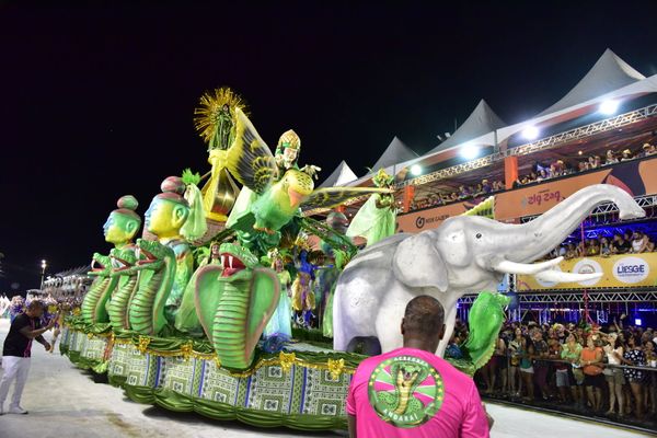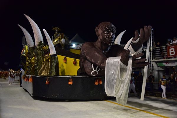Parte de uma das estruturas do carro chegou a cair na avenida bem no momento em que passava na frente dos jurados. Ninguém ficou ferido. Na passarela da folia, 1,1 mil componentes em 16 alas e mais dois carros alegóricos seguiram contando a história da África ao município da Serra. >