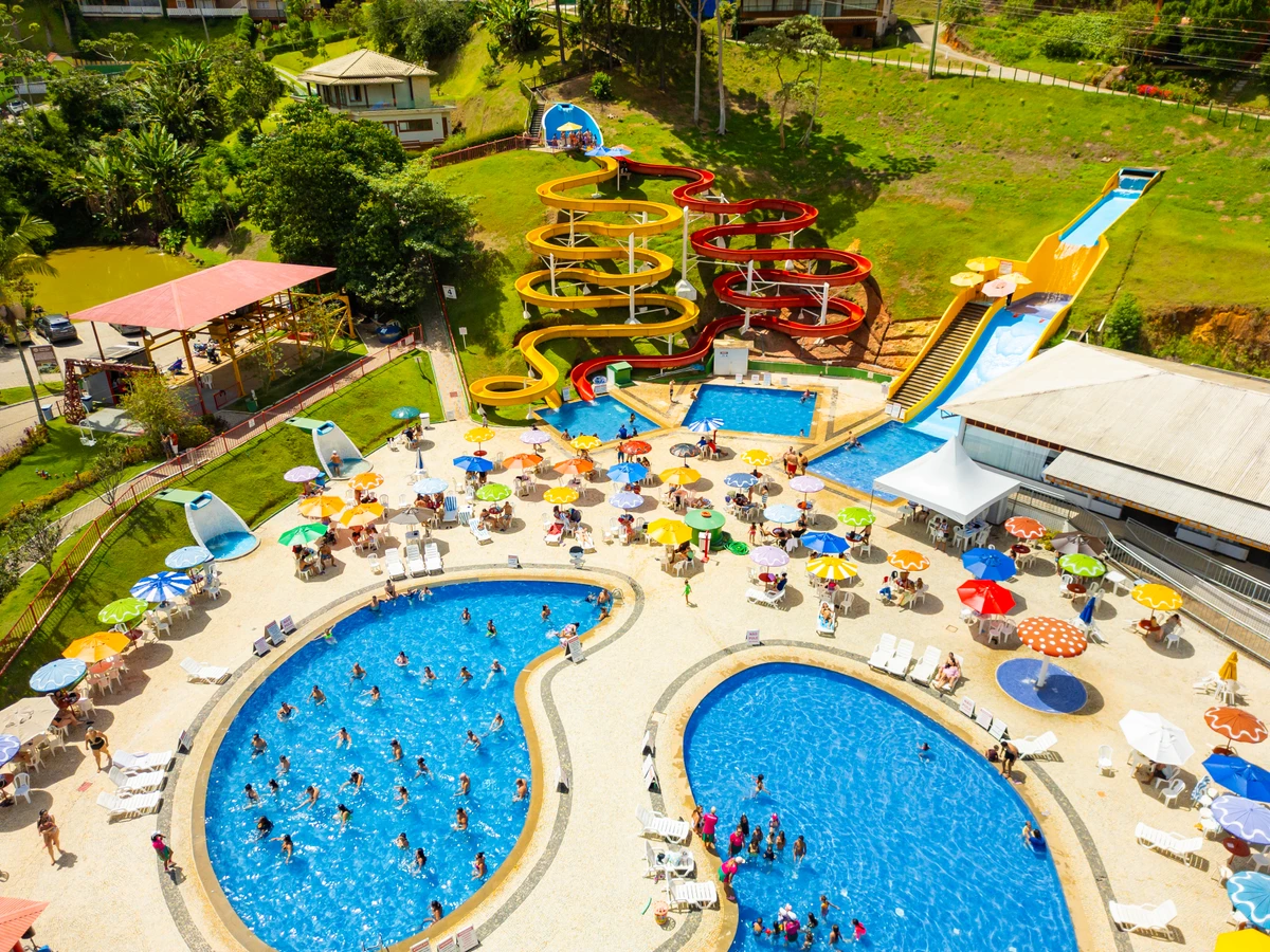 O resort conta com 250 unidades de hospedagem entre chalés e suítes, com opções que acomodam até seis pessoas por unidade, distribuídas em dois ambientes — reforçando sua vocação familiar. Todas as unidades têm TV LCD, ar-condicionado e frigobar; algumas contam também com hidromassagem. >