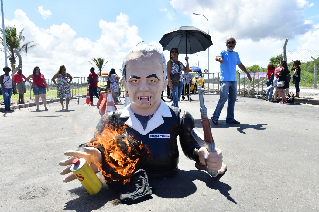 Um grupo levou um boneco "vampirão", que faz referência ao presidente, e foi impedido de entrar no aeroporto. Mesmo debaixo de sol, eles se concentraram na Avenida Adalberto Simão Nader, nova entrada do complexo, e reivindicaram o direito de participar da cerimônia, além de criticar o governo Temer. Revoltados, eles também impediram que carros entrassem no local. Outros veículos que passavam pela avenida buzinavam em apoio ao grupo.>