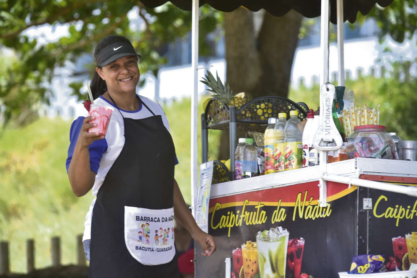 E para matar a sede de quem vai à Praia da Bacutia, no cardápio da Nádia Araújo, 37 anos, tem água de coco, refrigerante, cerveja e, os mais pedidos, drinks de frutas. A comerciante trabalha há quase dez anos no local e chega a vender mais de 3 mil drinks em um dia de muito movimento. Cada um custa entre R$ 12 e R$ 25.>