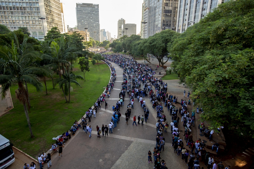 Um mutirão de emprego no Vale do Anhangabaú, no centro de São Paulo, gerou uma enorme fila na manhã desta terça-feira (26). São seis mil vagas oferecidas por 30 empresas em diversas áreas. Entre as milhares de pessoas que foram ao local para apresentar o currículo estava o cozinheiro capixaba Bruno Coutinho, de Vitória, o primeiro da quilométrica fila, que chegou ao local às 9h de segunda-feira (25).>
